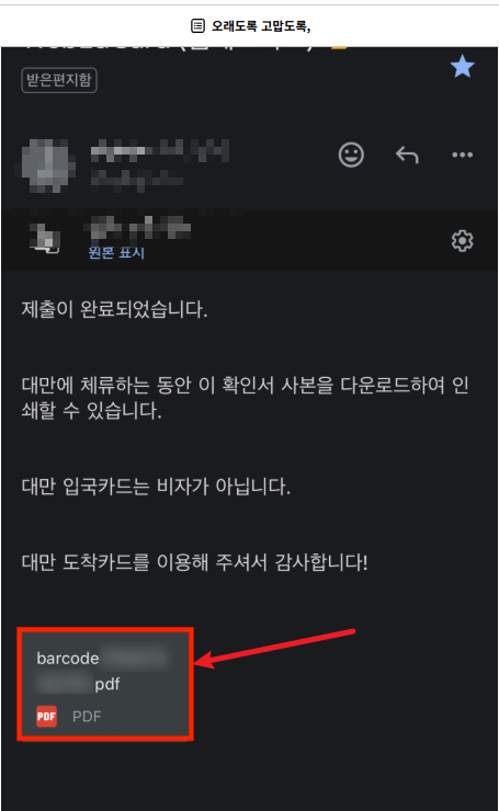 작성 후 이메일로 PDF 입국신고서 수신됨